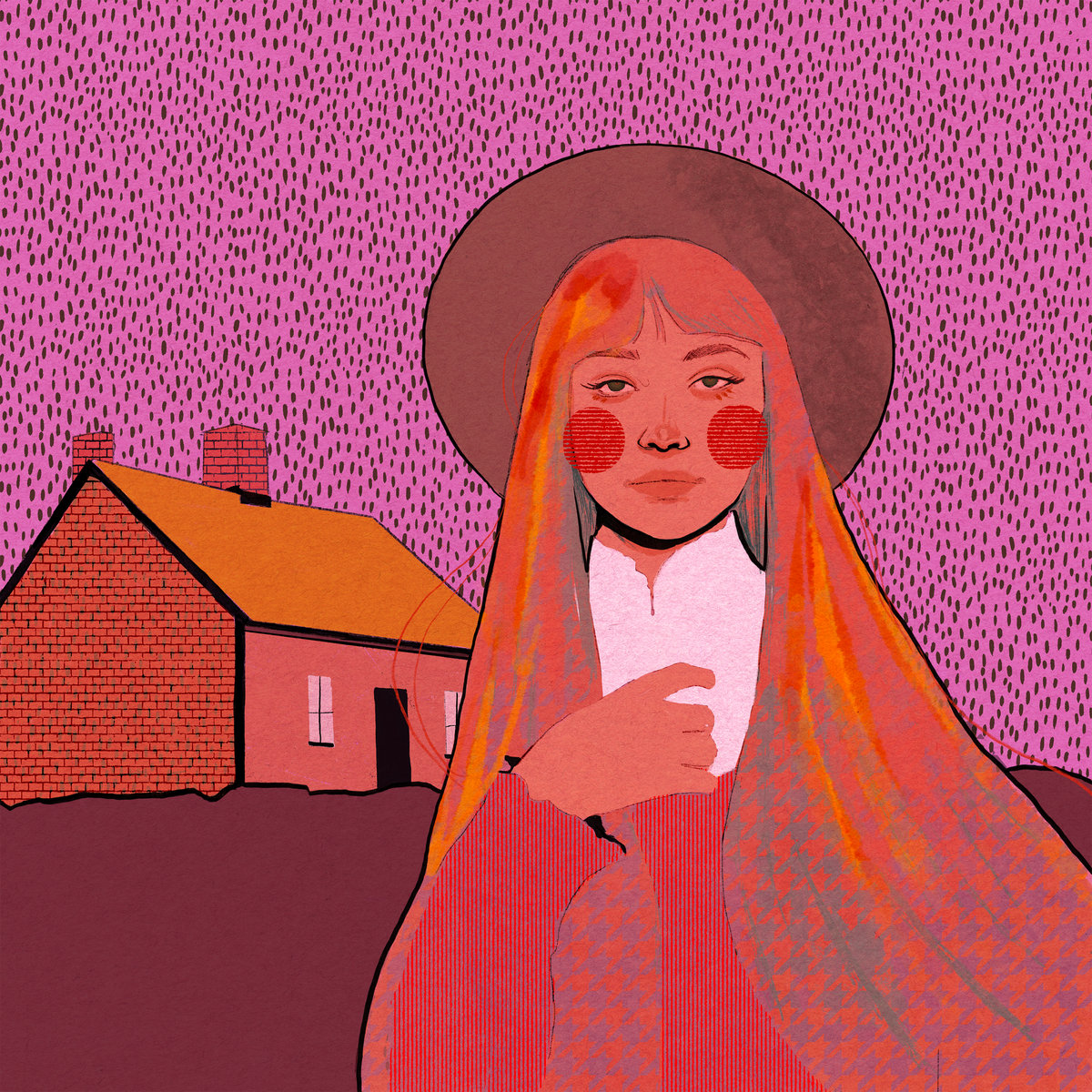 ジャケットは鮮やかなピンクとオレンジの色彩によるイラストが印象的で、中央には頬に真っ赤な円を描いた女性が、背景には均等に降り注ぐような筆致のパターンが敷き詰められた中に家が描かれたデザインとなっています。